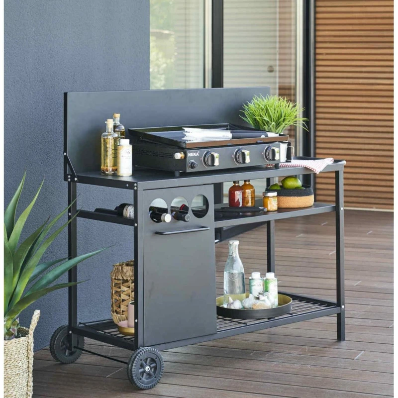 Cette desserte de plancha en métal noir de la marque Neka vous permettra de poser votre plancha et d’ainsi de cuisiner à hauteur en toute tranquillité.