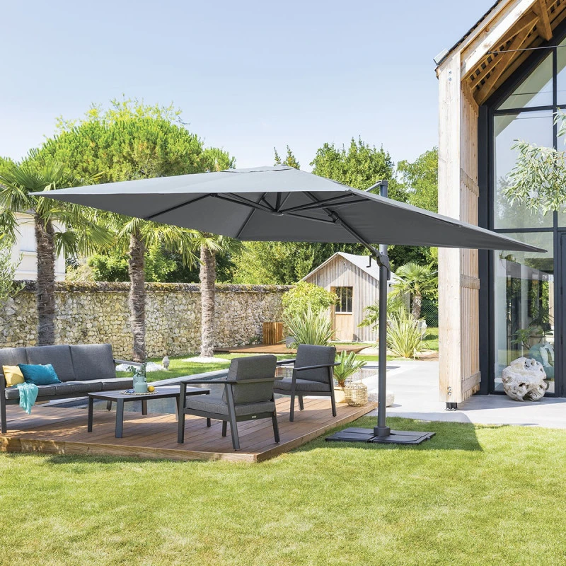 Protégez vous du soleil tout au long de la journée grâce au parasol décentré Eléa inclinable coloris ardoise de la marque Hespéride.