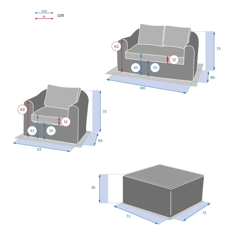 Salon composé de 1 canapé 2 places (140x89xH73 cm) + 2 fauteuils (93x89xH73 cm) + 1 table basse carrée (72x72xH36 cm).