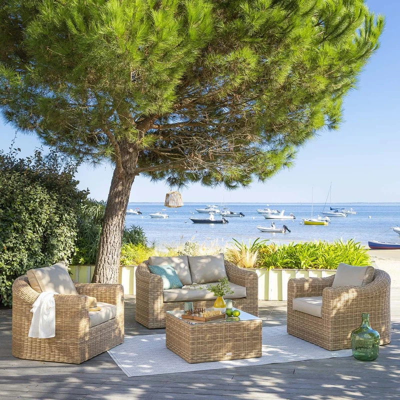 Le salon Mooréa dispose d’une structure en aluminium traité époxy antirouille habillée de résine synthétique tressée.