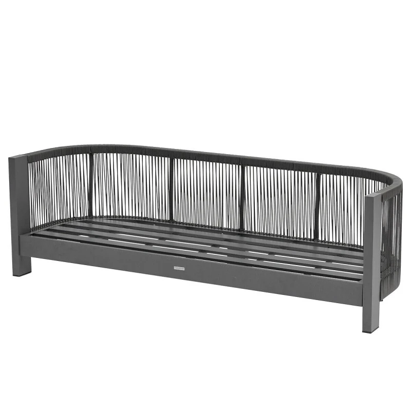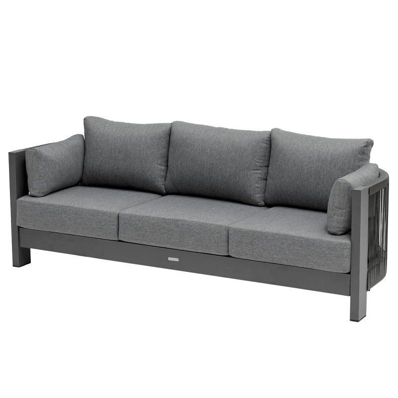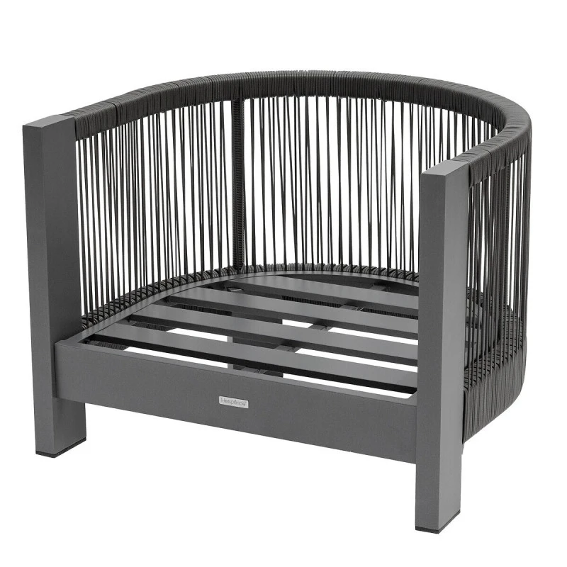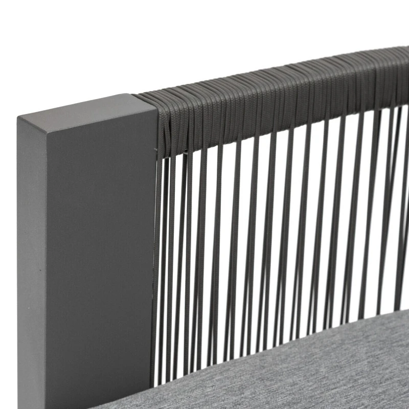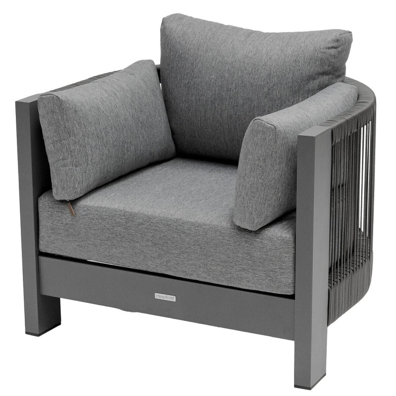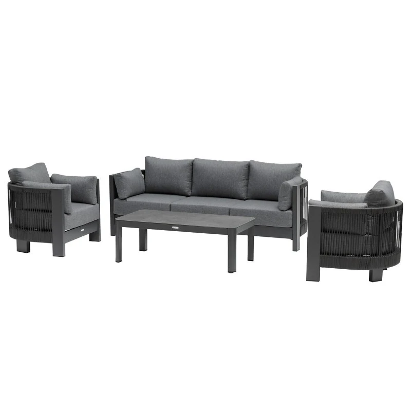 Très résistant, ce salon dispose d’une structure en aluminium traité époxy antirouille. Les coussins d’assise en oléfine (230 g/m²) sont conçus pour résister à la décoloration et aux pluies fines. Ils sont déhoussables pour un entretien facile. Enfin, les cordes sont en acrylique et le plateau en résine plastique.